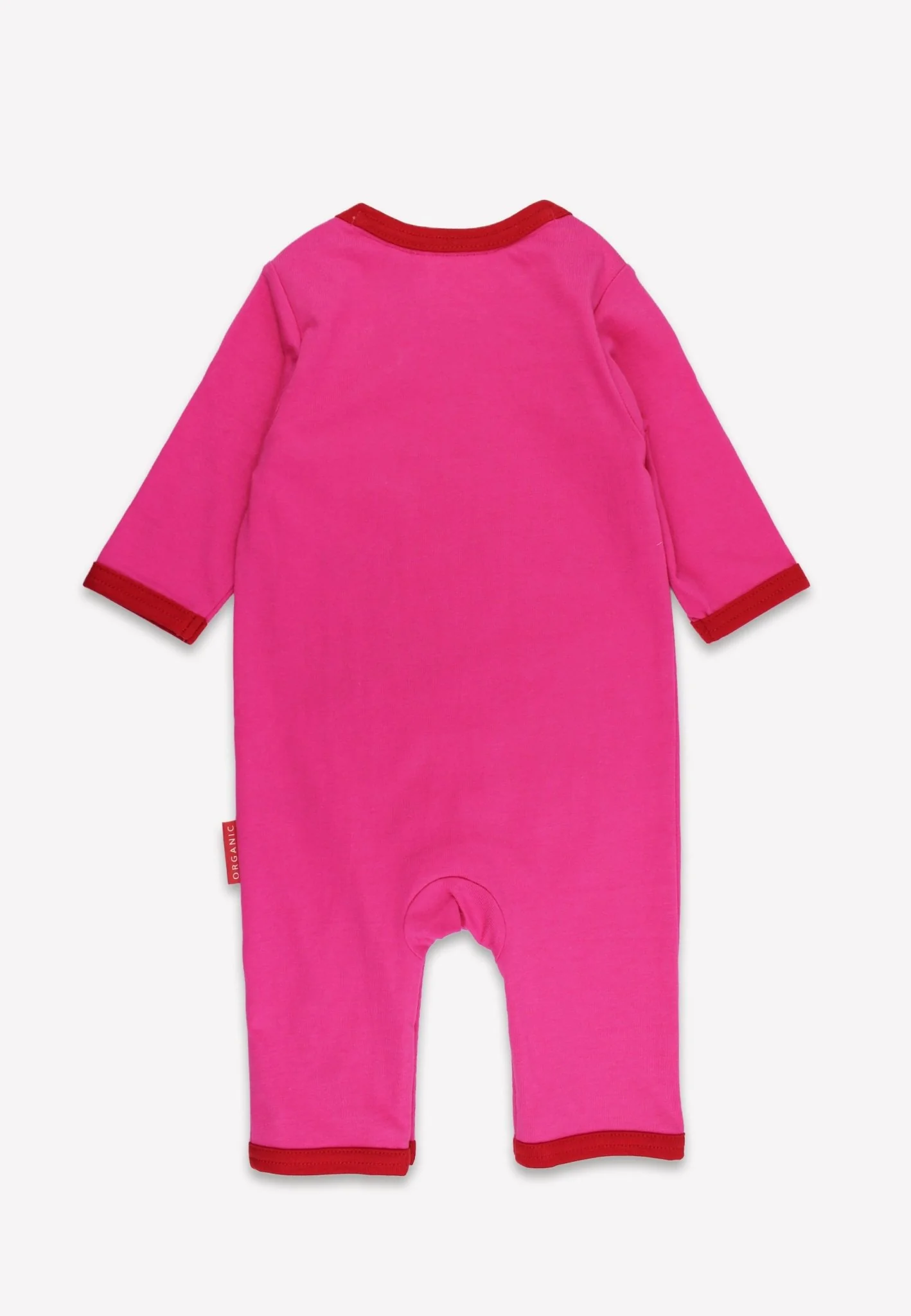 This Organic Bunny Hop Appliqué Pink Sleepsuit is a cosy and cute choice for your little one. Made from 100% GOTS-certified organic cotton, it features a soft pink base with red trim and a charming bunny appliqué beside two flowers.