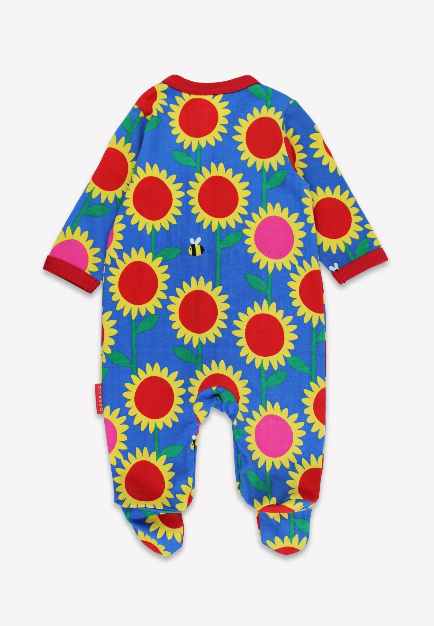 Wrap your little one in the cheerful charm of this Organic Sunflower Bee Print Sleepsuit. Featuring a bright blue base adorned with sunny yellow, red, and pink sunflowers buzzing with friendly bees, it’s a playful delight for bedtime.